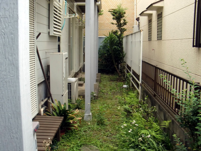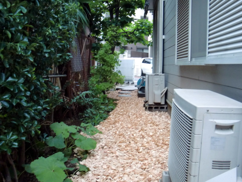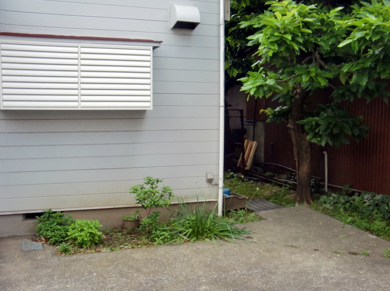 玄関と犬走りがあります。柿の木の新緑が綺麗です。