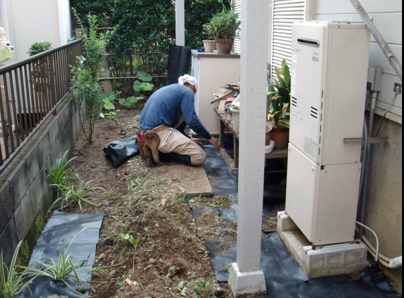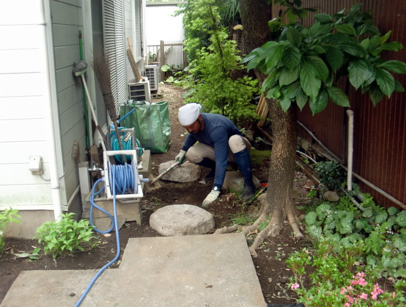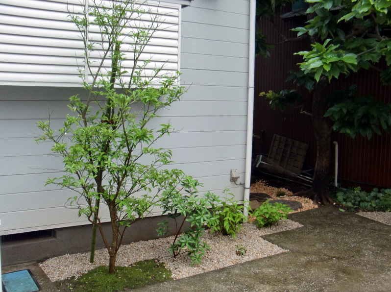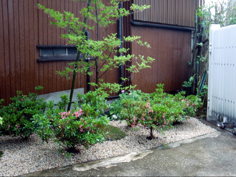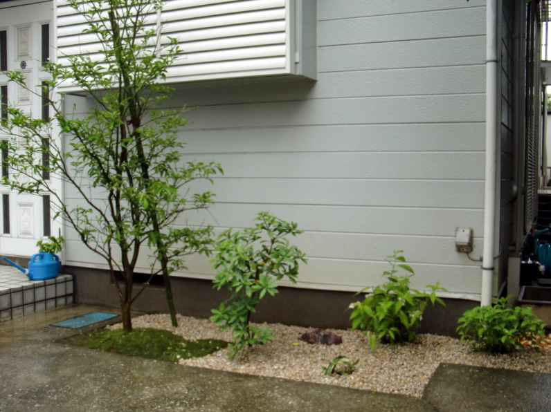 既存の低木や苔は移植し、新たに本柚子、エゴノキ、サツキ、アセビを植栽しました。