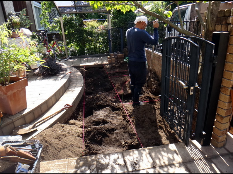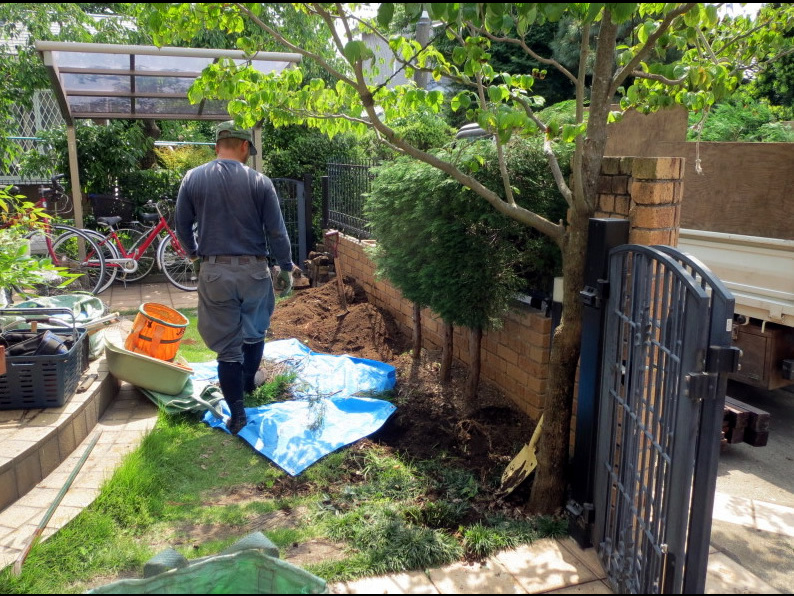 作業開始です。まずは樹木を抜根し、花壇の見栄えを良くします。