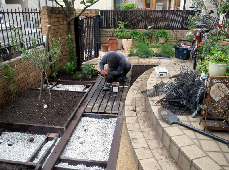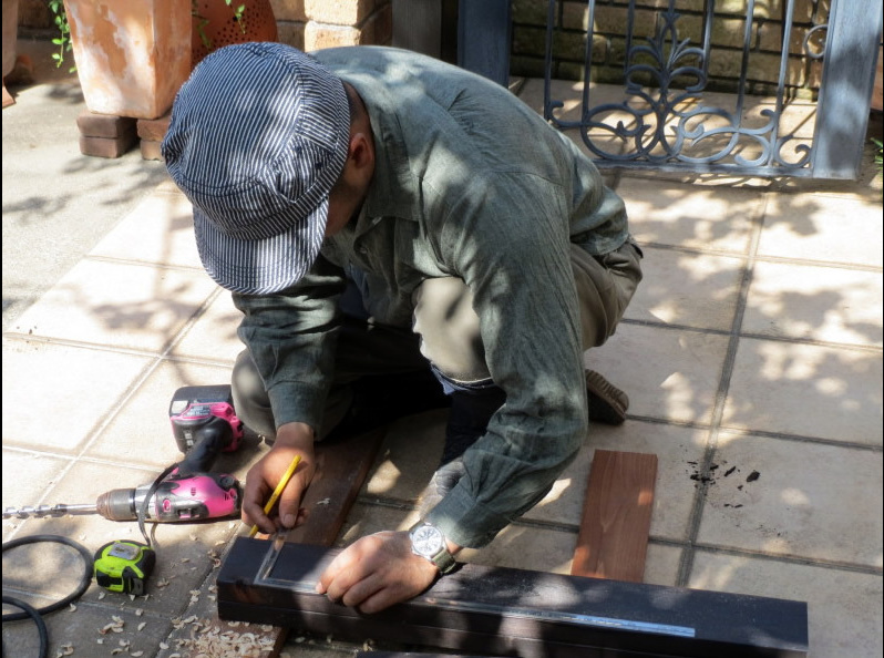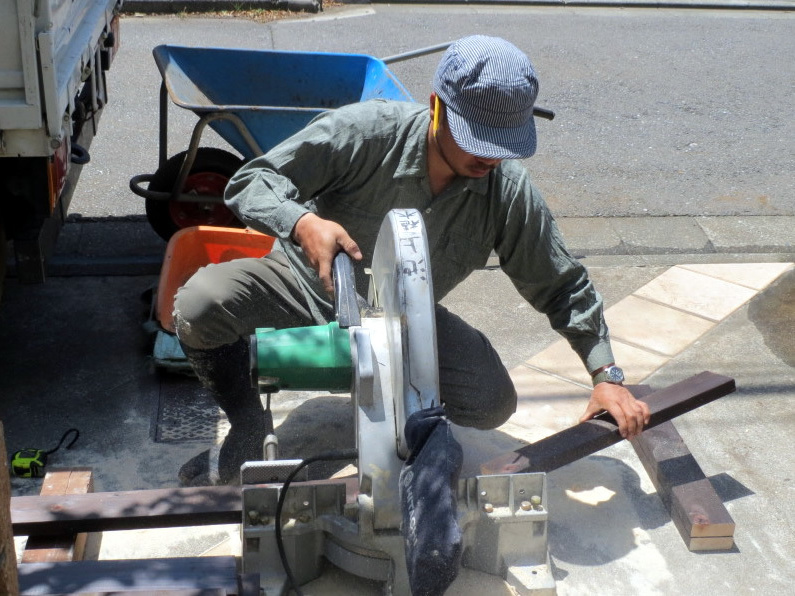 材料を加工し、花壇と木道を作ります。材料は国産の檜材です。