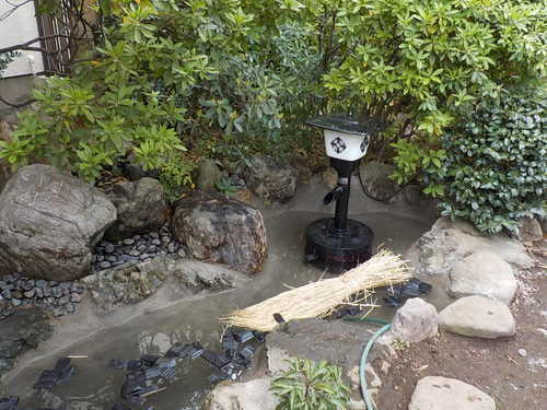 雨が降り溢れないように排水を付けました。完成後、水を入れ、アク抜きのために藁、炭を入れアクを取り、水質が良くなるまで、約一か月後、完成です。水質が良くなるまで、お客様の手伝いもあり、鯉が泳いでいる写真をいただきました。ありがとうございます。