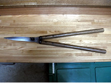 刈り込み鋏とは柄の長い鋏のことです。仕立物や生垣などで木の枝葉を刈って形を整える鋏です。鋼の材質や刃渡、柄の長さや柄の材質、刈り込み鋏の形に種類があります。主に門の形、山の形、刃が重なりあった時ストッパーで止まるタイプ、刈り込み鋏も様々です。購入する時は個人の使いやすさ、好きな形もありますのでどれがいいとも言えません。しかし鍛冶屋さんの手造りから生み出される逸品は、最高にいいものです。切れ味、形が美しく、使わないで飾りたいほどの品もあります。庭師をはじめめて最初に覚えたのが、掃除と刈込みでした、最初はなかなかうまくいかず、大変でした。鋏が安定せず、苦労した思い出があります。